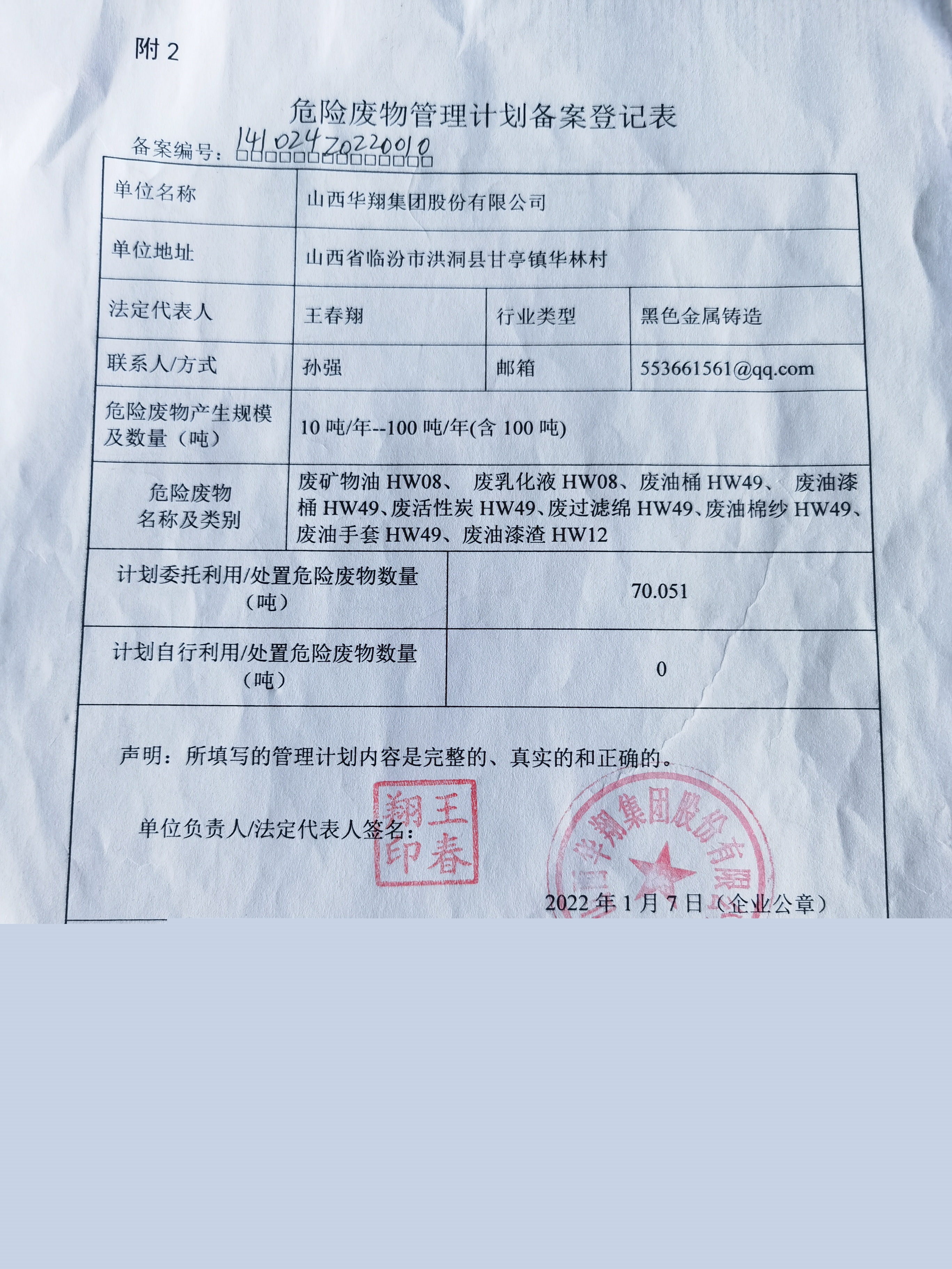山西華翔集團(tuán)股份有限公司位于山西省洪洞縣甘亭鎮(zhèn)華林村,年產(chǎn)鑄件35萬(wàn)噸,生產(chǎn)經(jīng)營(yíng)過(guò)程中產(chǎn)生的危險(xiǎn)廢物主要包括廢油、廢油漆桶、廢油手套、廢油棉紗、廢油桶、廢過(guò)濾綿、廢活性炭、廢油漆渣、廢乳化液等9種。按照《中華人民共和國(guó)固體廢物污染環(huán)境防治法》,對(duì)所有危險(xiǎn)廢物的產(chǎn)生、運(yùn)輸、貯存、處置環(huán)節(jié)規(guī)范化管理,按規(guī)定申報(bào)危險(xiǎn)廢物管理計(jì)劃備案登記表,并在縣生態(tài)環(huán)境部門(mén)備案,相關(guān)情況公示如下: